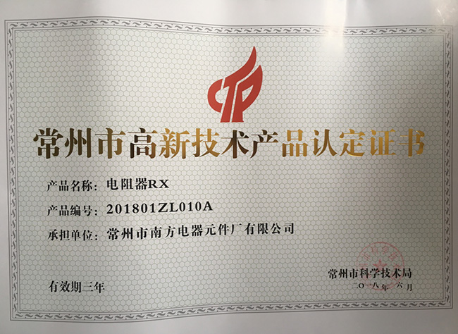 2018年6月我们公司的 电阻器产品 被 常州市科学技术局 认定为 常州市高新技术产品 并颁发证书。